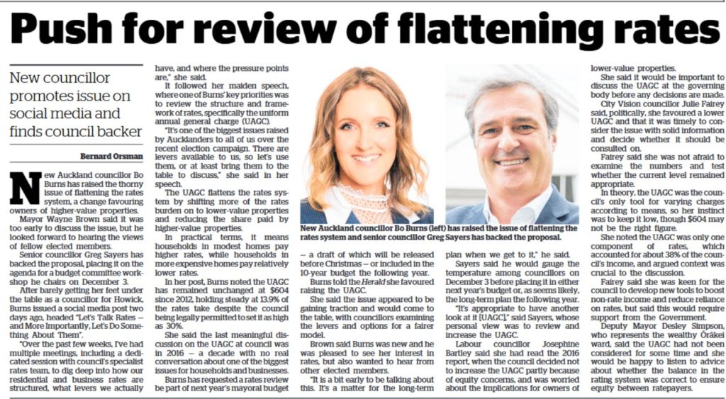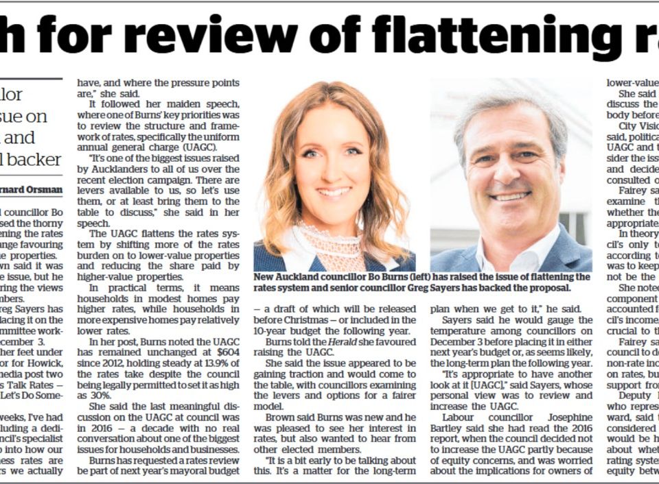 24 November. NZ Herald by Bernard Orsman. New Auckland councillor Bo Burns has raised the thorny issue of flattening the rates system, a change favouring owners […]